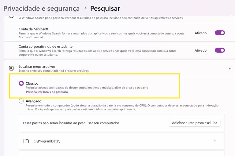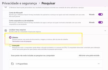 Ajuste: Em "Pesquisa local", você pode selecionar o modo "Clássico" ou excluir pastas que você raramente usa da indexação. Isso reduz o esforço do hardware em segundo plano.